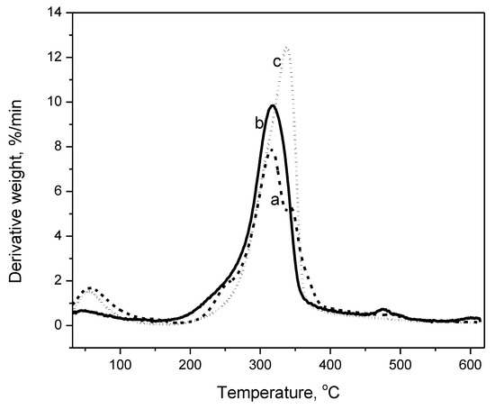 Derivative thermogravimetric (DTG) curve of (a) raw CP, (b) CNF procedure I, and (c) CNF procedure II.