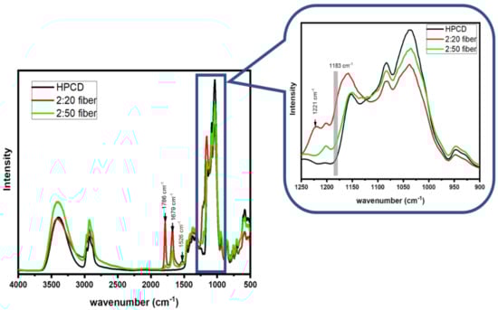 FT-IR spectra of HPCD and as-spun Chi:HPCD fiber (2:20 and 2:50, respectively) without normalization. The expanded region of the inset spectra is shown between 1250 and 900 cm−1 of the original spectra.