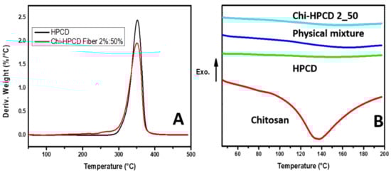 Thermal analysis results of as-spun Chi:HPCD fiber. (A) DTG plots of HPCD and Chi:HPCD 2:50 fiber; and (B) DSC profiles of chitosan, HPCD, physical mixture, and as-spun Chi:HPCD 2:50.