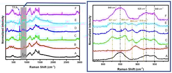 Raman spectra of precursors and different Chi:HPCD fibers: (A) HPCD, (B) pristine chitosan, (C) as-spun Chi:HPCD 2:50 fiber, (D) as-spun Chi:HPCD 2:20 fiber, (E) Chi:HPCD 2:50 fiber after 3 days and (F) Chi:HPCD 2:50 fiber after 3 months. The expanded region (Right) cover the region between 770 and 990 cm−1.
