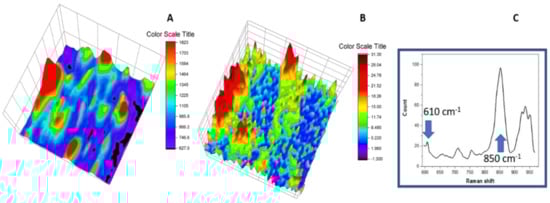 To assess the interaction between chitosan and HPCD, the TFA content was minimized for the Chi:HPCD 2:50 fiber by exposing the fibers to the open atmosphere under adequate ventilation at ambient conditions. This setup favored the volatilization of excess TFA that may influence the sensitivity of the fiber characterization by reducing contributions of high spectral intensity that arise from TFA. The combined use of Raman microimaging along with a suitable dye probe afforded a spectral method that highlighted the chitosan fiber domains that enable the spectral characterization of the regions of interest. Rhodamine 6G was chosen as the dye probe for this study because of the reported favorable binding of chitosan [] relative to HPCD with the Rhodamine 6G dye [,]. Benzene was used as the solvent to avoid the dissolution of fiber components and to maintain the integrity of the electrospun fiber system as it is a poor solvent for such polysaccharide systems (Chi:HPCD). The characteristic Raman signature at 610 and 850 cm−1 corresponded to the C–C–C ring in-plane bending for Rhodamine 6G [,] and the respective ring breathing band for the HPCD glucopyranose unit [] that was used to construct the 2-D Raman images.