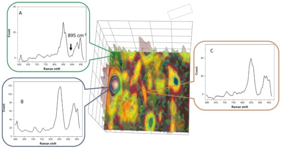Figure 5A,B was combined into one additive 2-D image, as shown in Figure 6 to emphasize different structural domains of the fiber: a chitosan rich area, a chitosan/HPCD mixed area and a HPCD rich area. In the spectrum for the chitosan rich domain (Figure 6A), a Raman signature related to the ring breathing mode of chitosan was noted at 895 cm−1. This band had no apparent spectral change when compared against the Raman spectrum of pristine chitosan (Figure 4B). Moreover, the shape of the spectral band at ~850 and ~930 cm−1 for all samples (Figure 6A–C) were nearly identical. This may further suggest that HPCD has no direct intermolecular interactions with the chitosan polysaccharide chain of the fiber.