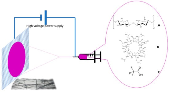 A schematic illustration of the electrospinning setup and molecular structure of the precursors: (A) chitosan where R = –COCH3 or H depending the degree of deacetylation, where n depends on the relative molecular weight of the biopolymer; (B) hydroxypropyl-β-cyclodextrin (HPCD); (C) trifluoroacetic acid (TFA) is the solvent system.