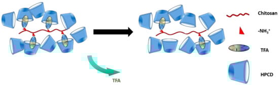 Chi:HPCD 2:20 and 2:50 fiber were produced via electrospinning of a mixture of HPCD and chitosan using TFA as a solvent. The composition of Chi:HPCD fibers was determined using thermal analysis and complementary spectral methods. TFA was found to be a constituent in the Chi:HPCD fiber assembly. The heterogeneous morphology and composition of this electrospun fiber was revealed using SEM and Raman imaging, along with a dye-based probe method []. Interactions among the components were also characterized using complementary methods, such as IR/Raman spectroscopy. TFA appears to have multifunctional properties as a solvent during the electrospinning process, but also protonates chitosan and stabilizes host–guest interactions with HPCD. Hence, the presence of lateral binding sites along the chitosan backbone (cf. Scheme 2) due to electrostatically bound TFA are found to play a crucial role in the effective dispersion of chitosan and the reduction of repulsive forces during electrospinning between chitosan polymer chains that favor fiber formation. There was no clear evidence of direct interactions between the glucosamine moiety of chitosan and HPCD in the solid-state according to Raman imaging, along with the dye probe method. The combined complementary results herein account for the fiber formation process as the role of weak host–guest supramolecular interactions that arise from the formation of a facial complex, which have been independently reported []. In turn, we envisage that such controlled-release supramolecular disassembly will contribute to the development of “smart coatings” that may utilize diverse types of chitosan polyelectrolyte complexes.