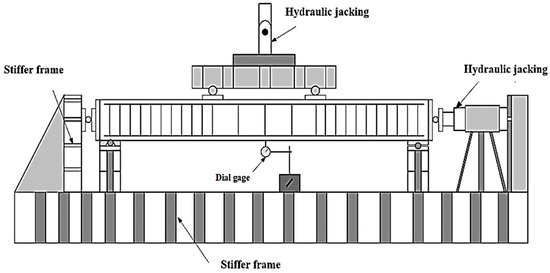 The experimental work was conducted in the structural laboratory of the civil engineering department of Al-Qadisiyah University. Ten RC beam–column members with a dimension of 160 × 200 × 1500 mm3 were tested under constant axial force and a four-point transverse load up to failure. The reinforcement details of the beam–column members are shown in Figure 1. Two deformed bars with 10 mm diameters and two other bars with 8 mm diameters were used for longitudinal tension and compression reinforcement, respectively. For stirrups, a 6 mm diameter was used at a spacing of 50 mm, except the middle third span of the member, where the spacing used was 100 mm. The clear concrete cover was 20 mm on all sides of the specimen.