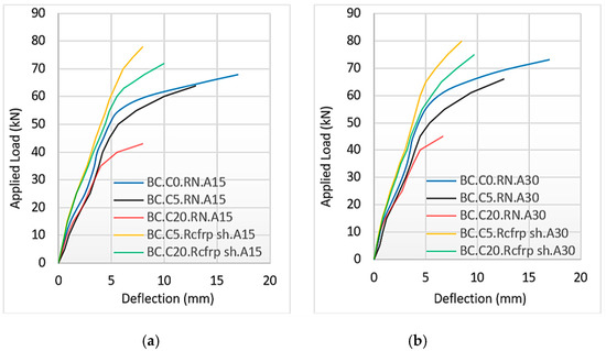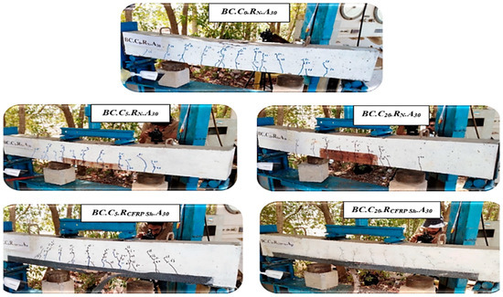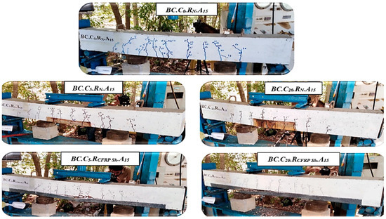 Five specimens (BC.C0.RN.A15, BC.C5.RN.A15, BC.C20.RN.A15, BC.C5.RCFRP Sh.A15, and BC.C20.RCFRP Sh.A15, as shown in Figure 6 were tested under a constant axial force of 15 kN, and we gradually applied a transverse load up to failure. Horizontal corrosion cracks appeared before testing due to internal pressure from the corrosion product. First, flexural cracks appeared in the middle third span of the tension face and started to propagate and widen. Then, inclined flexural shear cracks were shown. A flexural yielding followed by a concrete crushing failure occurred for the control and low corrosion specimens. A premature rupture of the corroded bars or a sudden rupture of the CFRP sheet were shown for high corrosion or strengthening specimens, respectively. A significant reduction in the ultimate flexural strength and serviceability was recorded with an increased level of corrosion degree in addition to a lower stiffness in all stages of load-deflection response. An improvement in defected/rehabilitated specimens was noticed in the behavior and increase in the ultimate strength by 22% for low corrosion level and 67% for high corrosion level with respect to corresponding defected specimens. Serviceability in terms of mid-span deflection was restored to the allowable limit of the American concrete institute (ACI) code.
