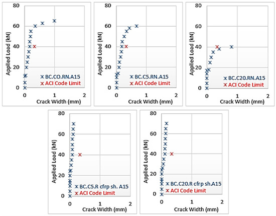 During testing, the maximum crack width was recorded for flexural cracks in critical sections (maximum moment and corrosion region), as illustrated in Figure 8.