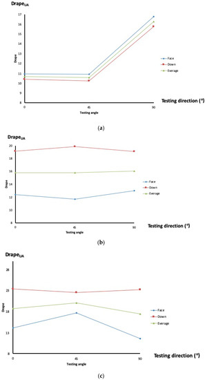 The comparison between drape data DrapePh and fabric linear density when all 40 fabrics forming a single group is provided in Figure 9a. A disappointing correlation of r = 0.197 suggests that it is not a good idea to put fabrics of different types into one group to compare their drape behaviors. Once divided into smaller groups based on the fabric linear density λ, Group 2 (27 light fabrics only) shows an increased r value to 0.696 in Figure 9b, and further to 0.901 for Group 3 (11 Medium and heavy fabrics) in Figure 9c. That is, grouping fabrics based on linear density indeed improves performance comparability.