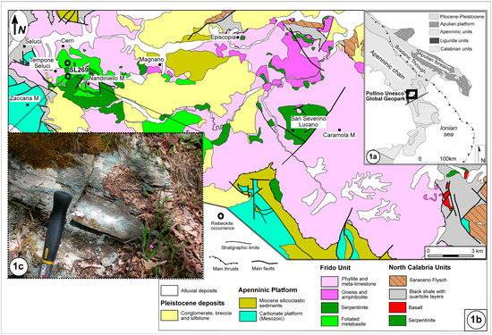 (a) Simplified tectonic sketch of the southern Apennines; (b) geological map of the northeast area of Pollino Unesco Global Geopark with samples site; (c) outcrop of mylonitic green Mg-riebeckite schists associated to foliated metabasites.