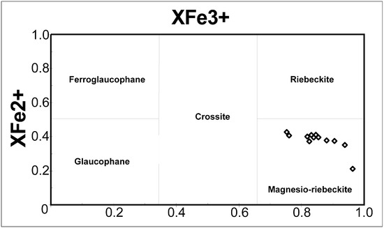 The amphibole structural formula in samples is recalculated on the grounds of 23 oxygens. Cations per formula obtained by electron microprobe of these amphibole range from: Si = 7.75–8.09, Na = 1.32–1.72, CaO = 0.32–0.67, Mg = 1.83–2.19, Al = 0.23–0.39, and Fe3+ = 1.26–1.88. Low amounts of several trace element (Mn and Cr) are also present in the crystals. Magnesio-riebeckite is grouped as sodic types amphiboles according to [42,43]. The diagram [44] allowed us to classify all the analyzed samples as Magnesio-riebeckite (Figure 4).