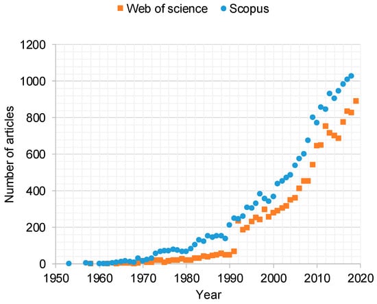 Number of published articles in Scopus (http://www.scopus.com), and Web of Science (https://clarivate.com/products/web-of-science/) from 1950–2018 using the term ”β-glucan“ in article titles, abstracts, and key words.
