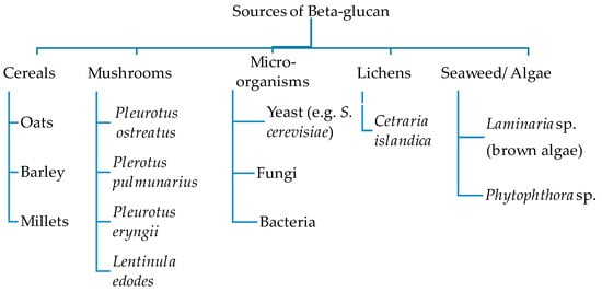 Historically, cereals have been the most well-known source of β-glucan. However, with the advancement in research, β-glucans have been identified and are extracted from microbial sources [,], as well as from some mushrooms, lichens, and seaweed/algae (Figure 2). Β-glucan occurs widely in the cell wall of these microorganisms (bacteria, fungi, yeast) and in the endospermic and aleuronic walls of the cereal grains (oats, barley, rye, and millets) [,].