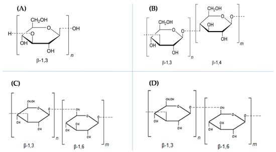 The chemical structure of β-glucan from different sources. (A) β-glucan from bacteria; linear β-1,3 backbone with no branches; (B) β-glucan from cereals, or lichens; linear β-1,3 or β-1,4 backbone with no branches; (C) β-glucan from some seaweeds (e.g. Laminaria spp); β-1,3 backbone with β-1,6 branches; (D) β-glucan from fungus or yeast; β-1,3 backbone with β-1,6 branches that are short (fungus) or long (yeast).