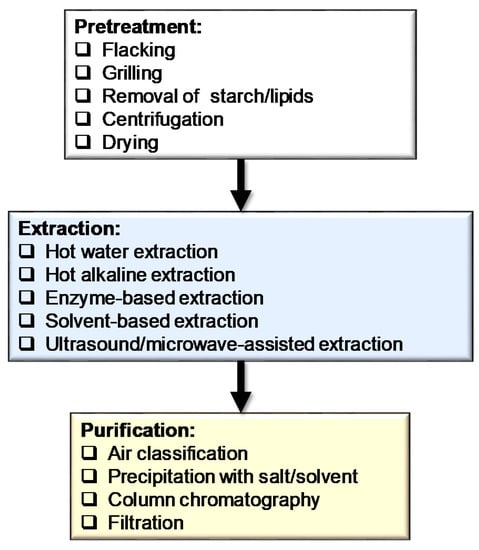 The techniques for the extraction of β-glucan vary with sources. The five main extraction methods used are: Hot water extraction [], alkali extraction [], enzymatic extraction [], solvent extraction [], and ultrasound/microwave-assisted extraction [,]. These techniques can be used alone or in combination. The entire extraction process of β-glucan in lab scale and industrial scale is shown in Figure 5. Interested readers should refer to [] or in depth information on the extraction and purification techniques of β-glucan from various sources.