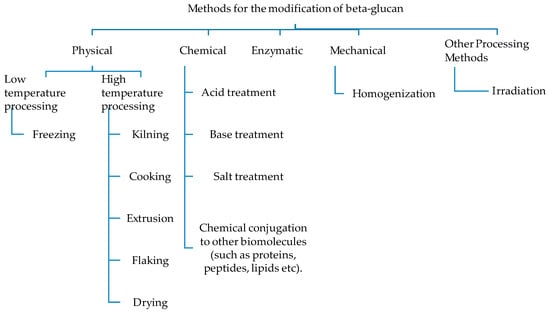 Physical treatments of β-glucan are used to modify the molecular, rheological, and morphological characteristics of the β-glucan. This technique involves both high and low temperature treatments used to modify the β-glucan, as shown in Table 1. High-temperature treatments (e.g., kilning, flaking, baking, cooking, and extrusion) constitute some of the most widely used techniques for the modification of β-glucan [].