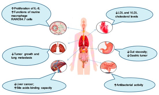 The effect of modified β-glucan on human physiology. IL-8, interleukin 8; LDLD, low-density lipoprotein; VLDL, very low-density lipoprotein; Data from [,,,,,,,,,].
