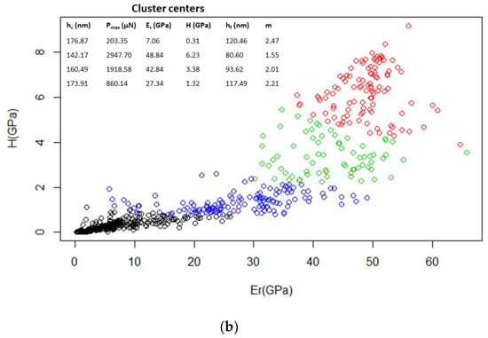 Epoxy matrix is not correlated to the mechanism of reinforcement, and these data do not contribute to identification of the reinforcement by surface modification of CFs. As a result, it was reasonable to remove these data using R language. After performing k-means clustering, the epoxy matrix nanoindentation events with a mean value of Er of about 7 GPa were not included by using library “dplyr” in order to obtain a proper descriptor of reinforcement and enhance classification model performance.