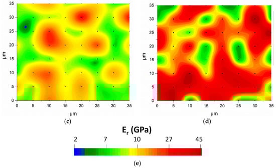Quantitative elastic modulus mapping of tested CFRP specimens: (a) pristine, (b) PMAA electropolymerized, (c) low pressure plasma modifies, and (d) with carbon nanotubes grown on carbon fiber surface; (e) represents the memo of Er.
