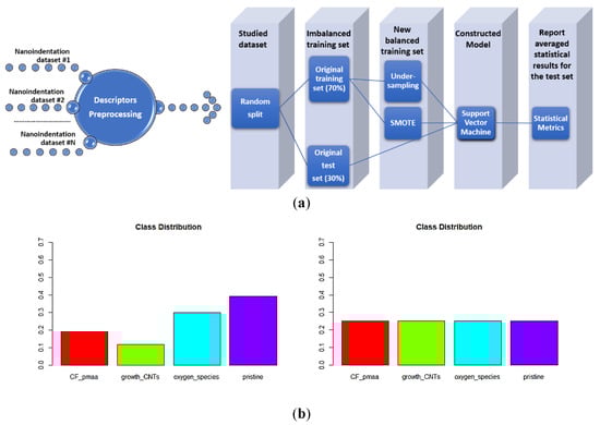 Existing classification models, such as decision tree (DT), neural network (NN), support vector machine (SVM) and k-Nearest Neighbor (KNN) are usually involved to perform supervised machine learning [14,15]. However, these models require representative and relatively balanced training datasets to establish process–structure–property (PSP) relations [13], as in CFRPs’ case. Despite progress in machine learning, it is still a challenging task to construct efficient algorithms for imbalanced datasets. Re-sampling preprocess has been proven to minimize discrepancy between class samples [14]. Undersampling and oversampling are employed to modified non-uniform distribution in classes of reinforcement to smallest or highest majority class, respectively [16]. However, undersampling contains the risk of losing important information contained in the majority class [15], while oversampling may increase computational cost. Often issues of ethics, confidentiality or lack of data, especially in recently growing scientific fields do not facilitate accessibility [17]. A better strategy to deal with imbalanced data may be a popular oversampling approach renowned as SMOTE (Synthetic Minority Oversampling Techniques), which oversamples the minority class by creating synthetic examples rather than by oversampling with replacement [14]. Thus, synthetic data produced in a representative and repetitive manner can solve this shortcoming and offer balanced datasets by introducing new, no-replicated minority class samples [18]. Consequently, better performance of the aforementioned machine learning models is ensured. In fact, prediction accuracy of an algorithm has been reported to be improved in a variety of datasets by applying these methodologies [19].