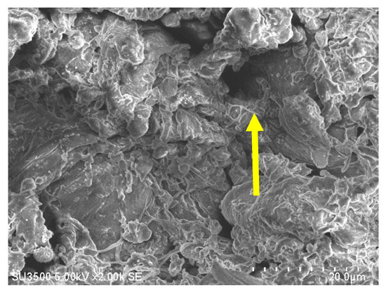 An example of an SEM image of sago fiber composite, taken from sample E9. The yellow arrow shows a void.