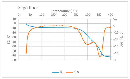 Reduction of sago fiber mass in the high-temperature range, i.e., above 250 ° C, is associated with hemicellulose decomposition, followed by cellulose decomposition. Two DTG peak points may represent these two decomposition processes. Hemicellulose degradation occurs at a lower temperature range (200 to 350 °C) compared to cellulose degradation (320 and 400 °C) [1]. Luis Cabrales et al. reported a study of thermal degradation of cellulose in cotton fiber. The inflection point (peak temperature of DTG) of cotton ranges from 350 to 400 °C. The degradation temperature of cellulose is higher for fibers with greater molecular weight [21]. In addition, lignin degradation might also contribute to the mass reduction at above 250 °C because lignin degradation can occur in a wide temperature range, from 100 to 900 °C [1].