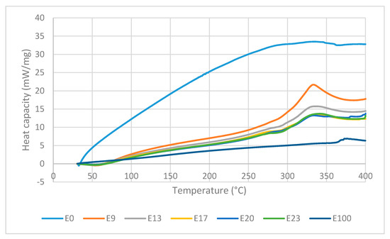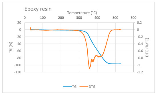 The TG/DTG curve of epoxy resin is shown in Figure 7. Epoxy mass decreases at a very high temperature, i.e., at above 300 °C. This observation is in accordance with a study conducted by Shigeo Hirose et al. They studied the glass transition and thermal decomposition of epoxy resin synthesized from the carboxylic acid system consisting of ester-carboxylic acid derivatives of alcoholysis lignin and ethylene glycol. It was reported that the thermal decomposition of epoxy resin begins at about 350 °C [22]. Three DTG peaks in Figure 7 indicate that the thermal decomposition of epoxy resin may include several types of decomposition.