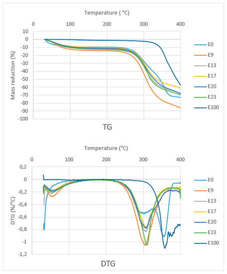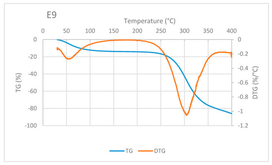 A typical TG/DTG curve of sago fiber-epoxy composite is shown in Figure 8, taken from E9. The decrease in mass of sago fiber-epoxy composite can be divided into three different temperature ranges. The first is in the temperature range below 100 °C and the second and third are at above 250 °C. It is noted that in the range above 250 °C, i.e., at a temperature above 300 °C, the TG curve gradient decreases. This indicates that different damage occurs at that high temperature. These three ranges of decrease in mass for several natural fiber-epoxy composites have been reported before [10,23,24]. FA Fauzi et al. divided the weight loss process of natural fiber-epoxy composites into two stages: (1) weight loss happened due to the vaporization from the fiber, (2) the weight loss due to decomposition of cellulose at 265 to 595 °C [25]. Comparing to our results, the weight loss in stage (2) should be a combination of fiber and epoxy decomposition.