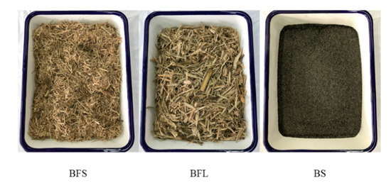 The sugarcane residues (raw bagasse and burned residues) were acquired from a sugar mill in Okinawa Prefecture, Japan. The raw bagasse was dipped in water at 30 °C for 30 min and then dried in the open air. The intent of this process was to reduce the residual sugar content of the bagasse and eliminate impurities [23,28,29]. Afterward, the residues were classified by the sieving process. The raw bagasse that passed through a 9.52 mm sieve and was retained in a 4.75 mm sieve was classified as large bagasse fiber (BFL), while the raw bagasse that passed through a 4.75 mm sieve and was retained in a 2.36 mm sieve was classified as small bagasse fiber (BFS). The burned residues that passed through a 1.18 mm sieve and were retained in a 0.297 mm sieve were classified as bagasse sand (BS). The physical properties of the materials are given in Table 1. Figure 1 shows the categorized residual materials which were used in this study.