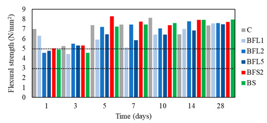 - The flexural strength was 6.46, 7.00, 7.78, 6.84, 7.92, and 7.93 N/mm2 after 14 days of curing and 7.36, 7.58, 7.60, 7.47, 7.72, and 7.96 N/mm2 after 28 days of curing for C, BFL1, BFL2, BFL5, BFS2, and BS, respectively. These values meet the requirement stipulated by JIS A 5371 of 5 N/mm2, which may be used as pavement for pedestrians and heavy vehicle traffic.