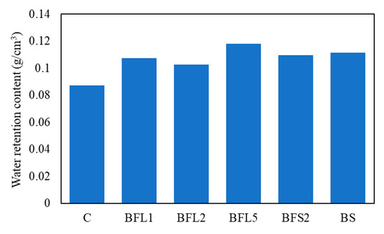 - The water retention content increases with the addition of the sugarcane residue. In the case of BFL5, which was prepared with bagasse fibers (4.75–9.52 mm) with a volume ratio of 5% in comparison to the total amount of aggregate, the water retention content achieved a value of 0.118 g/cm3, while the water retention content of the control composite C was 0.087 g/cm3.