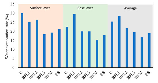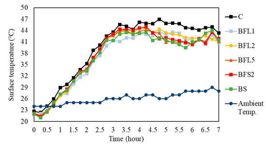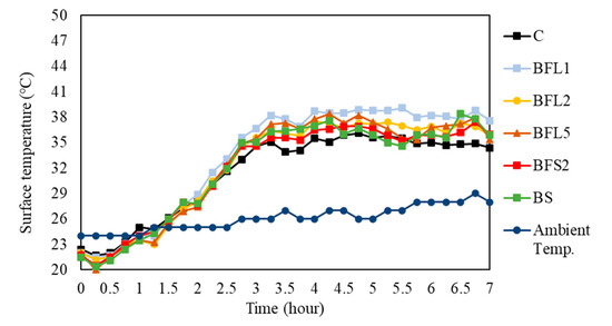 The averages of the surface temperatures of the surface layer for C, BFL1, BFL2, BFL5, BFS2, and BS were 31.4, 33.4, 32.3, 32.3, 31.9, and 32.0 °C, respectively. In the case of the base layer for mixes C, BFL1, BFL2, BFL5, BFS2, and BS, the average surface temperatures were 39.4, 37.0, 37.6, 37.3, 37.5, and 37.0 °C, respectively. Note that the average temperatures of the surface layers were lower than the temperatures of the base layers. This difference is due to the surface color. In the case of the surface layer, the mixture was prepared using a white Portland cement, and consequently, the surface color became white, which can reflect much more solar radiation than a grey color (base layer). The averages of the surface temperatures of both layers for C, BFL1, BFL2, BFL5, BFS2, and BS were 35.4, 35.2, 35.0, 34.8, 34.7, and 34.5 °C, respectively.