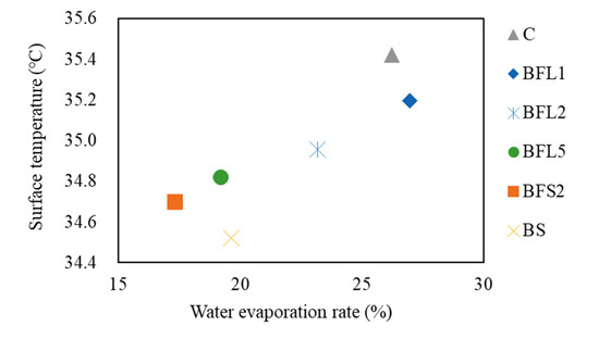 Figure 11 illustrates the relation between the surface temperature and the water evaporation rate. It is possible to see in Figure 11 that in the cases of C and BFL1 the surface temperatures and the water evaporation rates are higher in comparison to the other cases. From these results, it can be concluded that the surface temperature of the blocks may be reduced by the addition of a certain amount of sugarcane residue into the interlocking concrete blocks, which may mitigate the urban heat island. In addition, the reduction of the surface temperature when sugarcane residues are added into the blocks may be expected for a longer period since the water evaporation rate is smaller than C. However, other factors such as density, wind effect, and ambient humidity should be investigated, in order to the clarify the whole mechanism.