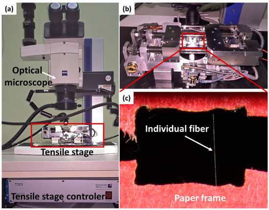 Figure 1. Experimental set-up for the tensile testing. (a) Macrophotography of tensile stage placed under the microscope, (b) tensile stage with a mounted sample, (c) sample image of PVDF fiber located in the frame.
