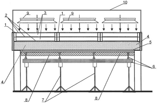 Layout of HT of a slab with BF-reinforced ECC using infrared rays for cast-in-situ construction in frosty weather: 1—clamps for fixing polyethylene-terephthalate membranes; 2—polyethylene-terephthalate membranes; 3—airbags (gaps); 4—concrete mix; 5—deck panels; 6—support beams; 7—telescopic stands; 8—heat insulation; 9—infrared appliance; 10—shelter-tent. Note: Heat insulation (8) and the shelter-tent (10) are not required if the ambient temperature is above +5 °C.