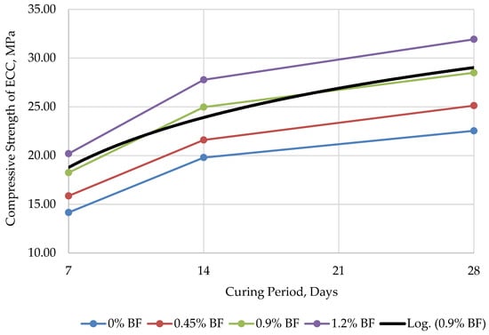 Based on the experimental study of the control ECC specimens (Table 5 and Figure 4), it can be concluded that BF works well with ECC, i.e., increments in the quantity of BF added to ECC led to an increase in the compressive strength. These experimental data are in good agreement with the results published earlier [1,2,12].