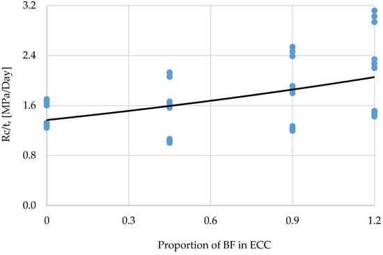 where Rc—compressive strength of ECC, [MPa]; —compressive strength of ECC (without BF) of the corresponding grade on the day of determination, [MPa]; 1.245—coefficient of compressive strength changes of ECC with BF over the period, [MPa/Day]; e—exponential function, e ≈ 2.71828; F—proportion of BF in ECC, in relative units; t—curing period, [Days] (t ≤ 28 days); and tF—exposure of BF in ECC, tF = t without unit.