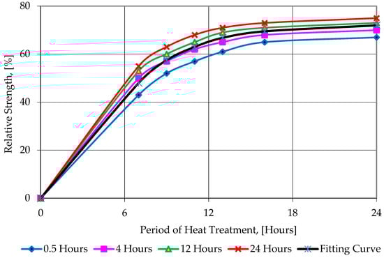 After processing the experimental data of Table 8, the diagrams of changes in the relative strength of BF-reinforced ECC at different cooling periods depending on the period of HT (Figure 6) were obtained. In order to make the relative strength (RR) more comprehensible in the diagrams, the unit of relative strength is shown in percentages. The fitting curve of the diagrams is shown as a black line.