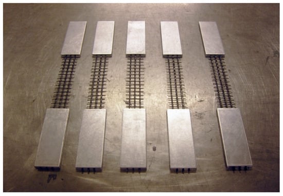 Fifteen specimens, each with a total length of 260 mm and width of 13.5 mm, were prepared and two couples of aluminium tabs were provided at the ends. The tabs were marked with a central longitudinal line to guarantee a good alignment with the basalt grid, and were then glued using a fast-setting bi-component epoxy; the strip ends were set to cure between the two glass plates for two hours with a heavy and uniform weight on top of the plates to attain the full strength before handling.