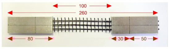 To avoid slippage of the sample ends while performing the test, pieces (tabs) of either rough paper or leather were positioned between the machine grips and the specimen extremities. The tabs, which were 50 mm long and the same width as the strips, were put at the top and bottom of the extremities of the basalt grid strip without any glue. Then, the specimen was positioned inside the jaws of the machine, gripping the extremities over a length of 50 mm.