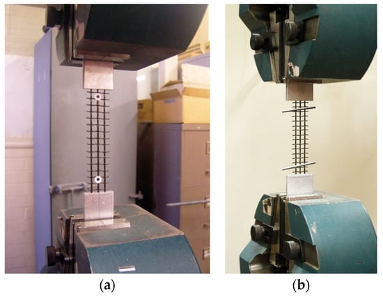 The tests were performed under displacement control using a universal testing machine with a bearing capacity of 110 kN. The first phase of the investigation was carried out to assess (1) the suitability of different tab materials for clamping the strips and (2) the influence of the displacement rate on the results and (3) the geometry of the samples. The second phase of the testing aimed at (4) obtaining the experimental stress–strain curves that were representative of the grid’s mechanical behaviour.