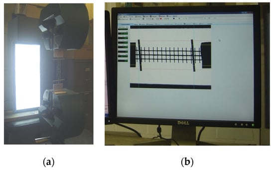 Test of a basalt grid strip using the backlight method: (a) specimen during testing and (b) software screen view.