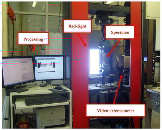 The video-extensometer is a contact-free measurement system for high-resolution bending and tensile strain tests for almost all types of materials. This device can measure displacements or strains between two or more assigned markers. The apparatus was connected to a computer, which stored and analysed the data using suitable software. The images acquired by the video-extensometer were processed directly during testing, based on the DIC software [29] provided with the instrument.