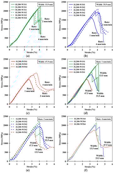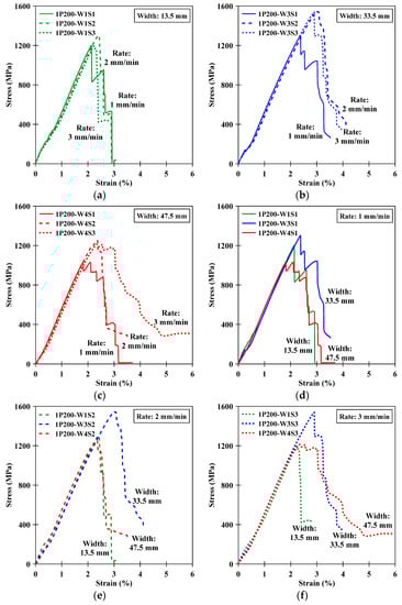The stress–strain curves of tests that were carried out using paper tabs are plotted in Figure 8. The first three plots (Figure 8a–c) show the curves obtained for different strain rates (1, 2 and 3 mm/min) of strips with the same width, while Figure 8d–f present the same results as a comparison between the different sample widths. The tensile strengths corresponding to the recorded loads and displacements were between 1031 MPa and 1547 MPa. Table 3 reports the peak stresses and strains, not including the failure modes.