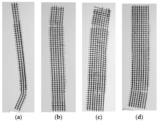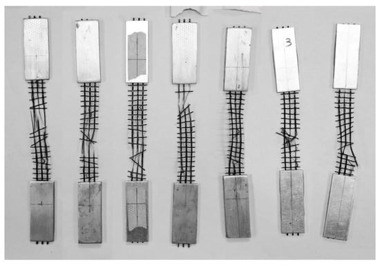 Figure 9 shows the basalt textile strips after being tested with the paper clamping method. All the specimens failed close to the gripping area. As can be seen in the photos, the external yarns on one side experienced a higher deformation and consequent rupture, which was probably due to an irregular stress distribution along the width.