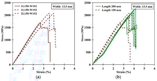 In addition, three samples were tested using a gauge length of 150 mm instead of 200 mm. The specimens were 13.5 mm wide, one of them was tested at a 1 mm/min rate, while the other two were tested using a rate of 2 mm/min. In Figure 12a, the stress–strain curves of the samples are presented. The outcomes confirmed that the lowest strength values were related to the lowest rate. In Figure 12b, the curves are compared to those obtained from samples having the same width but different length (200 mm long). The plot shows that the specimens with a smaller length did not present the reduced initial slope of the other curves. Figure 11d depicts the failure mode of one of the samples after its test.