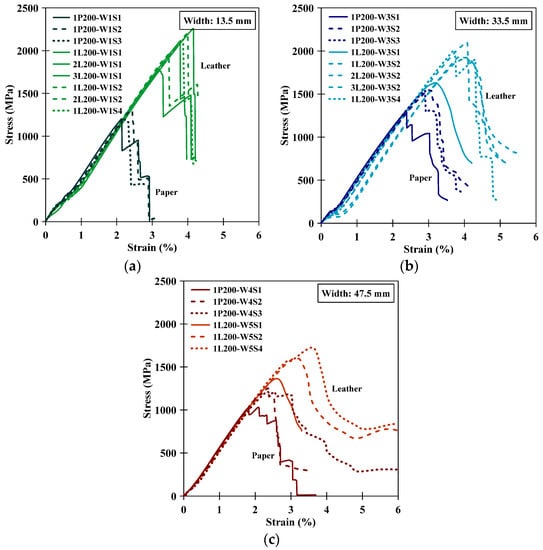 Comparison of the stress–strain results obtained from the 200 mm long specimens clamped using rough paper or leather tabs for different sample widths: (a) 13.5 mm, (b) 33.5 mm and (c) 47.5 mm.