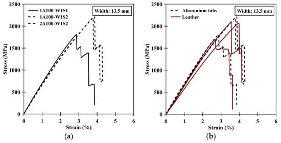 The curves obtained from the tests carried out using aluminium and leather are compared in Figure 14b. Except for one curve, which presented a slightly lower Young’s modulus, the curves were consistent in terms of both the stiffness and strength. The failure of the specimens was characterised by a progressive tensile rupture of the basalt yarns in the middle of the strips; slipping was not observed.