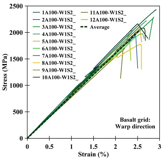The stress–strain curves of the twelve basalt strips are shown in Figure 16.