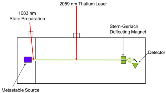 The atomic beam is collimated through slits, approximately 4 mils wide, to reduce Doppler broadening. The above laser and a 1083 nm laser depopulate the singlet and the m = 0 magnetic sublevel respectively. Separating the m = 0, +1, and −1 sublevels is done with a set of Stern-Gerlach magnets, which allows for selective detection of the m = 0 state via electron ejection from a gold plated grazing surface (surface Penning ionization or Auger deexcitation). The resulted electrons emit and are collected by a continuous electron multiplier. A signal is detected by using a spectroscopic modulated laser of 1083 nm to allow for observations of the J = 0, 1, 2 states and the comparison of the spacing of these levels allow for measurements of the fine and hyper-fine structure. The remaining gas is circulated through a liquid nitrogen dewar to remove background gas and to reuse the rare and expensive 3He.