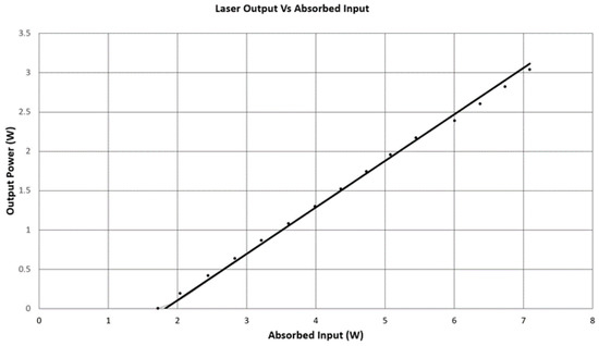 The laser shows a fairly abrupt threshold and a fairly uniform slope efficiency, see Figure 4. Under such conditions a simplified analysis may be adequate to determine if the laser is operating as expected, see for example [12]. It is important to point out that more detailed and complete laser models have been developed and reported in literature [4,9], and they help motivate the simplifications taken below. To estimate the slope efficiency, a homogeneously broadened lasing transition is assumed with no parasitic pump or laser absorption, no excited state absorption, hole burning, etc. In steady state, any attempt at additional population in the lasing level above threshold results in a shortened lifetime through stimulated emission. Hence, the slope efficiency ηslope is written as